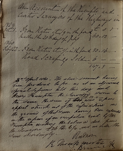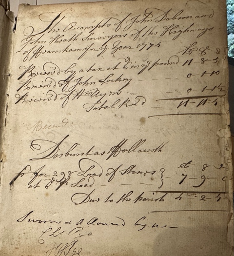 Although this book is quite fragile, when considered that it was used for nearly 100 years, it is in remarkable condition. It's also remarkable that such a small parish should have paid so much attention to it's highways. It may be that all parish's had a similar set up but their books have not survived. This book starts in 1774 and lists the accounts as noted by two local surveyors up to 1860. They note as they go where the money was spent and to whom. There is very little in the way of any narrative so it is a somewhat tedious read.